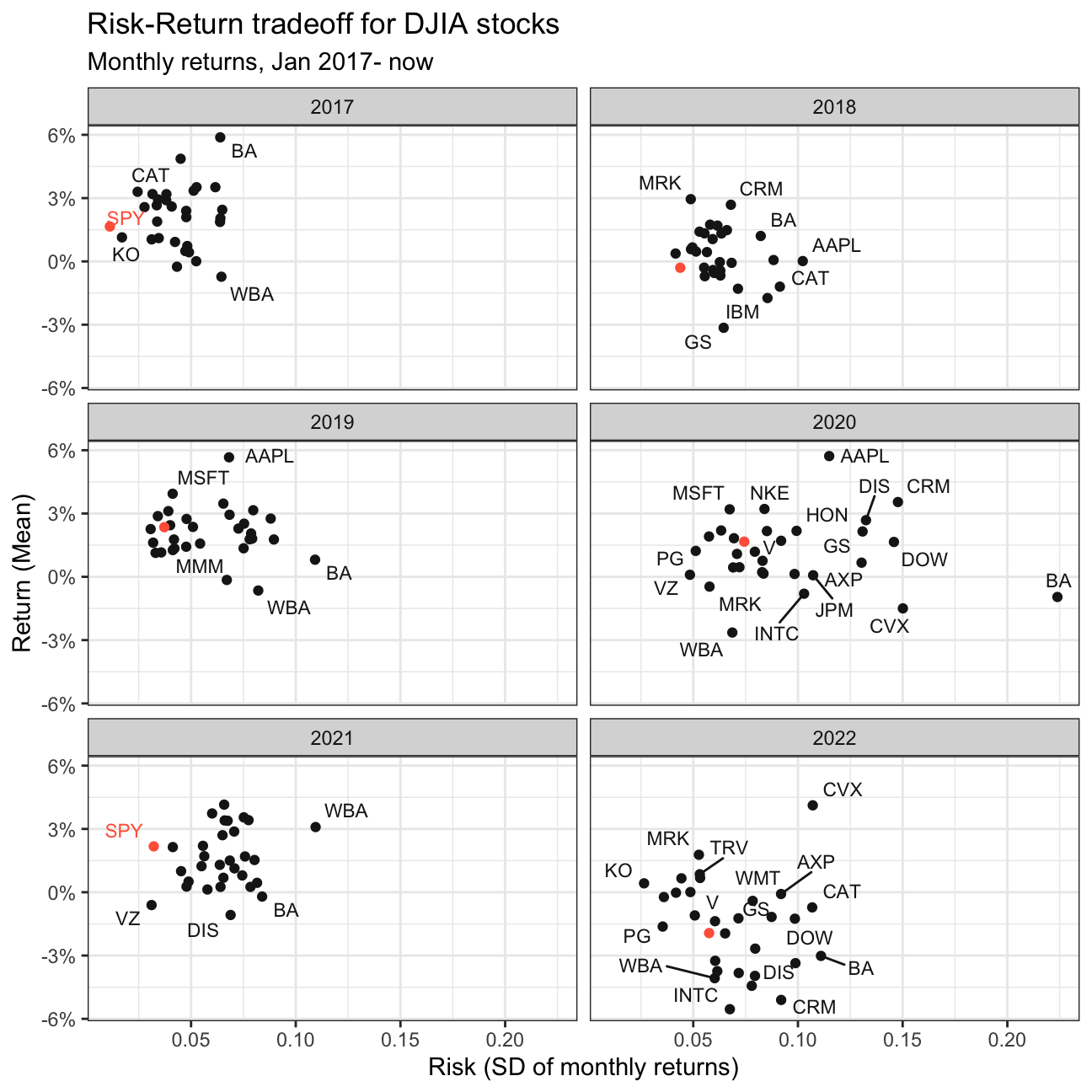 Next, let’s choose the Dow Jones Industrial Average (DJIA) stocks and their ticker symbols and download some data. Besides the thirty stocks that make up the DJIA, we will also add SPY
