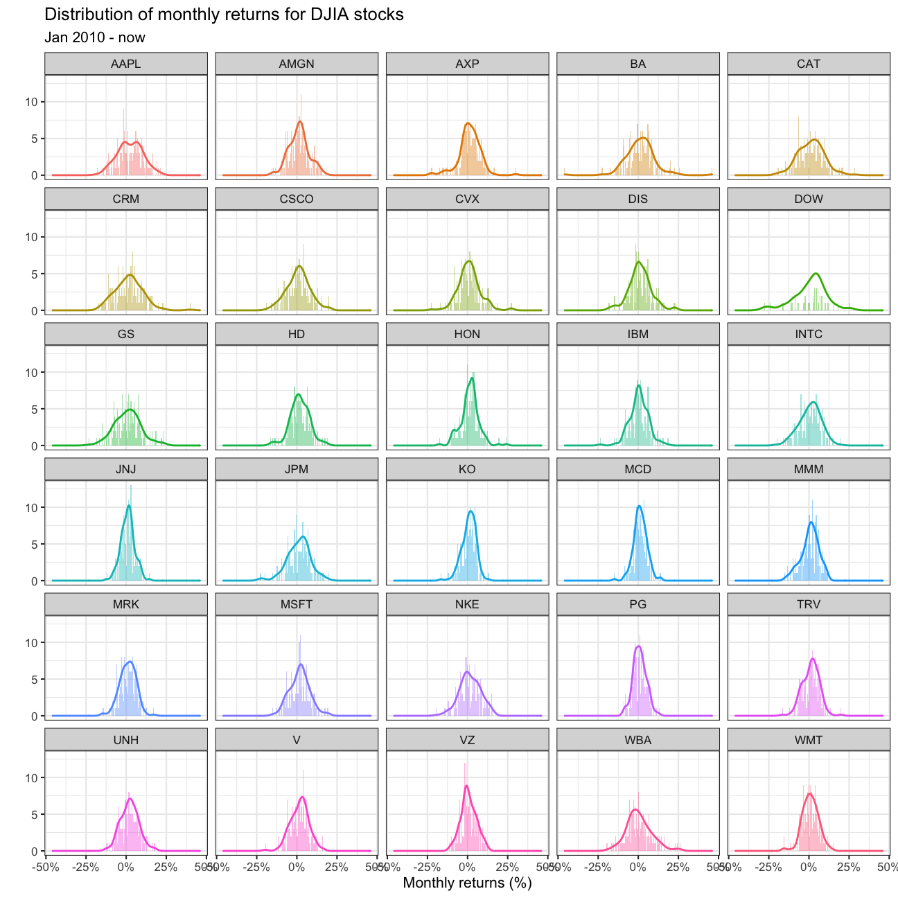 #visualise monthly returns since 2010, for each of the 30 DJIA stocks